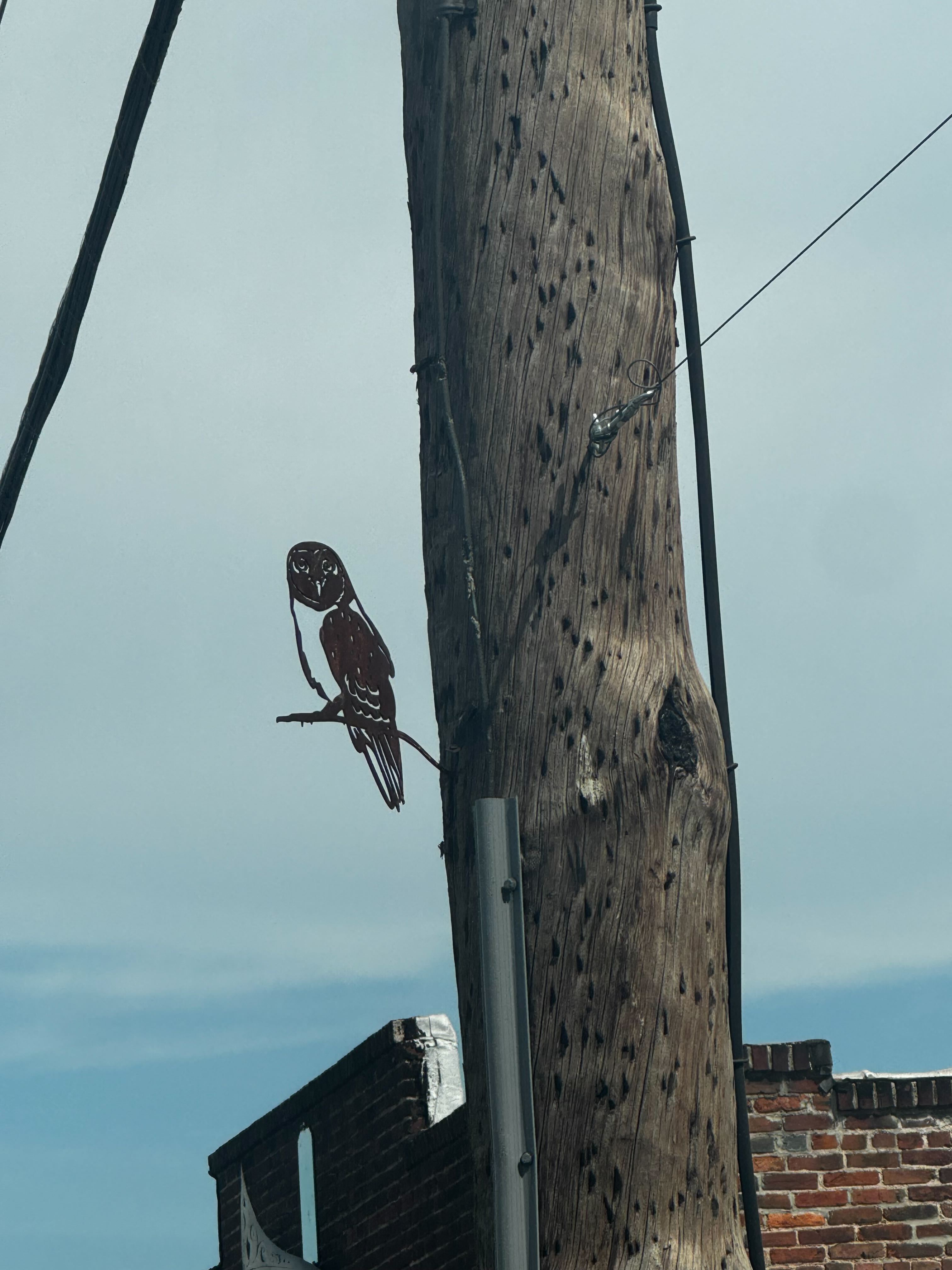 we parked the car in hampden to head into a toddler birthday party. my wife said "look at that owl" and my brain was like really? at 3 pm in the middle of hampden? alas it was not, just a metal owl nailed into a electrical pole right above us.
